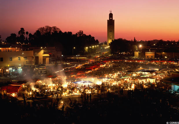 Vigorous and bustling Jemaa el Fnaa is a whirlwind of colour and noise, where concourse of people braid between packed stalls exhibiting brightly coloured spices, dry fruits and a thousand other goods, in the evening the square is packed with fire-eaters, acrobats, astrologers, and other characters of street entertainers.